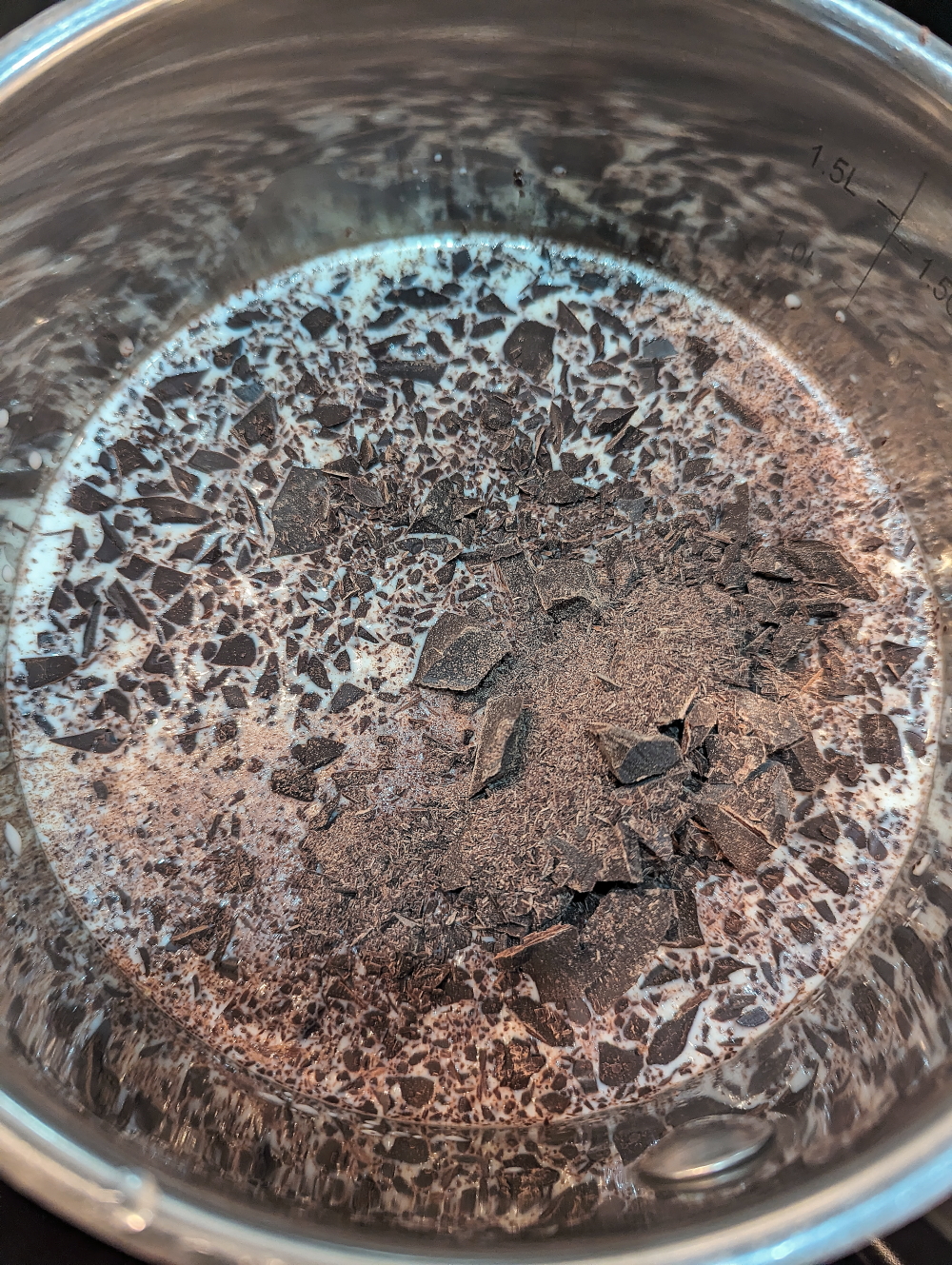 Chop up the chocolate in tiny bits. In a saucepan, heat up the milk and chocolate on low.