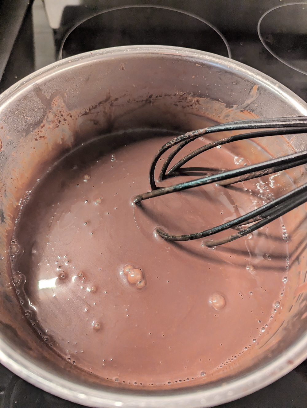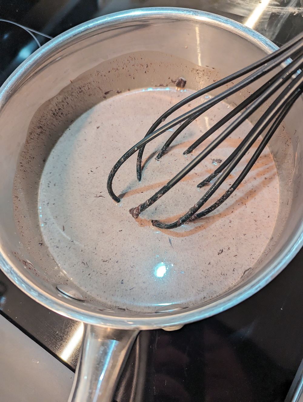 Keep stirring until the chocolate is completely dissolved and the liquid becomes smooth. You don’t want it to boil. At first it will seem grainy but keep stirring and the chocolate will melt into the milk. This will take about 2-3 minutes.