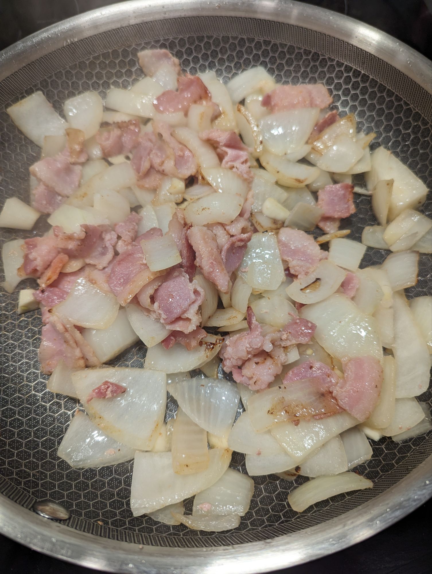 Start the rest of the feijoada by cutting and pan frying the bacon until slightly crispy. Reserve the bacon grease for the farofa. Add the onions to the pan and let it brown.
