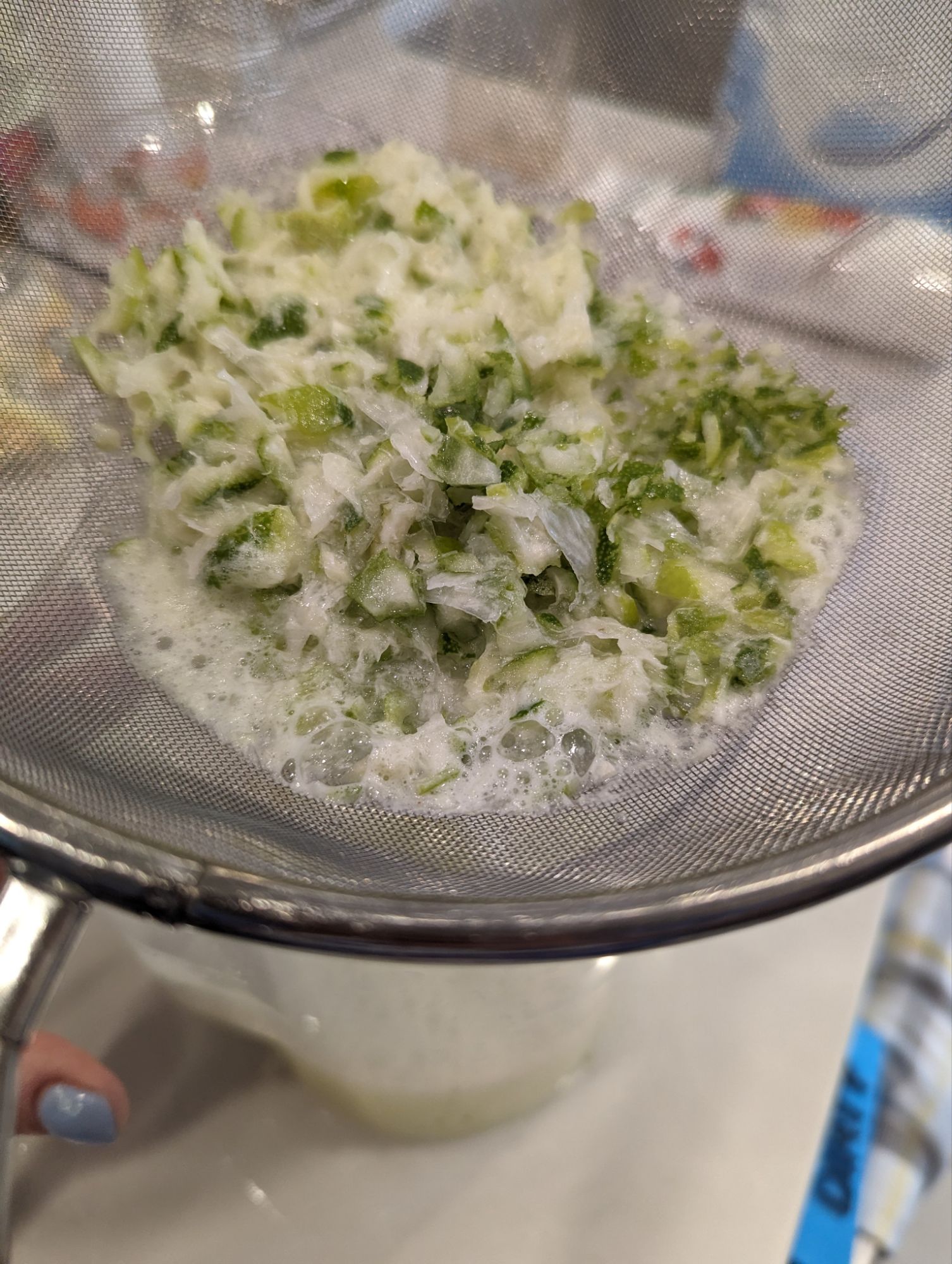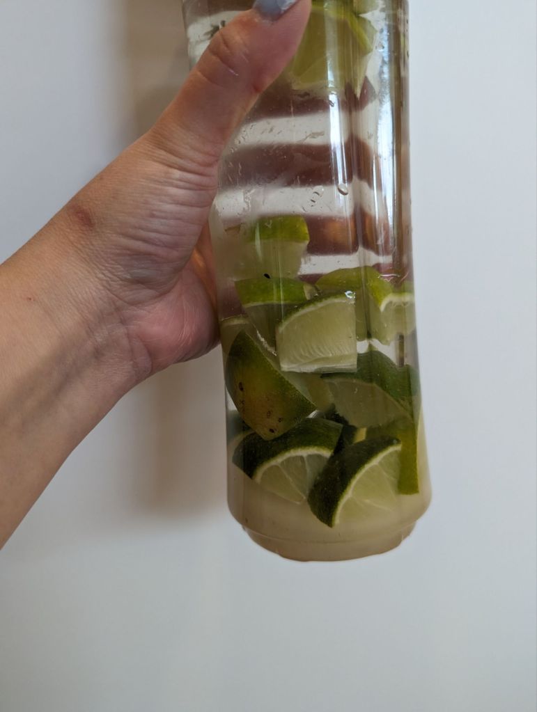 4. Pour the drink through a sieve to strain any of the lime skin and pulp out.