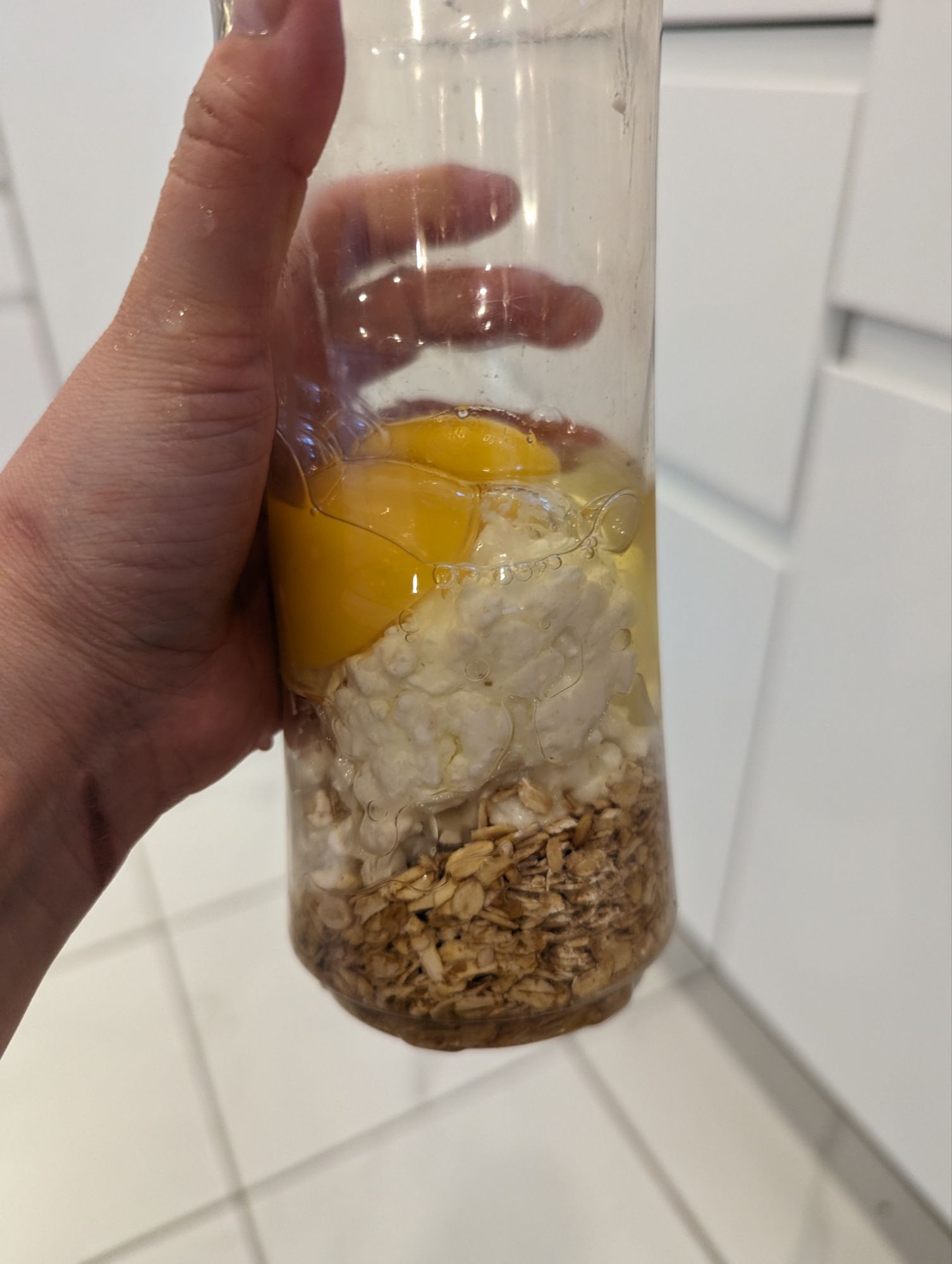 1. Put the cottage cheese, oats and eggs into the blender.