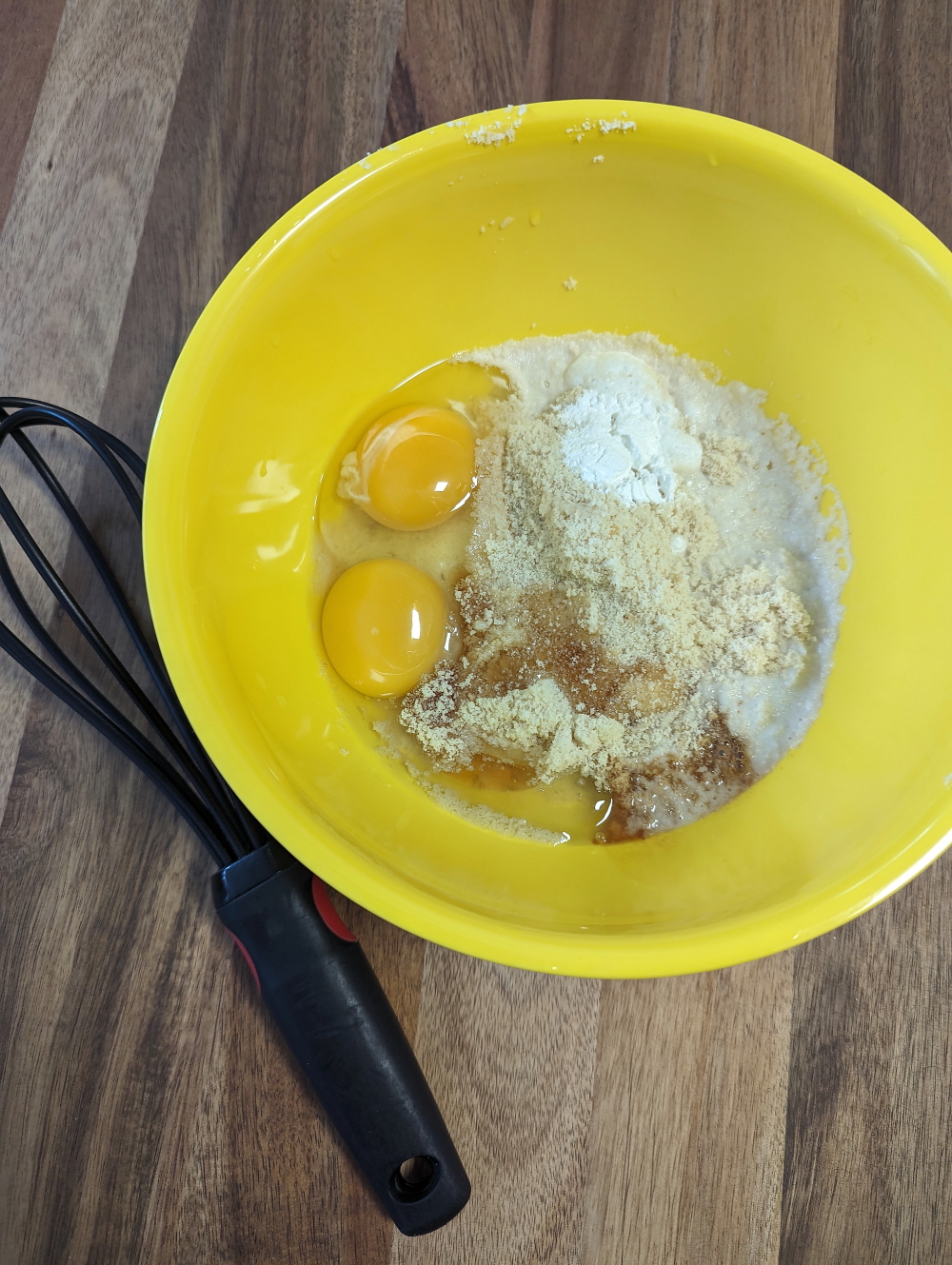 For this recipe, you need almond flour, eggs, vanilla, maple syrup, baking powder and milk. Next time I might do half almond and half all purpose flour to see how it works.