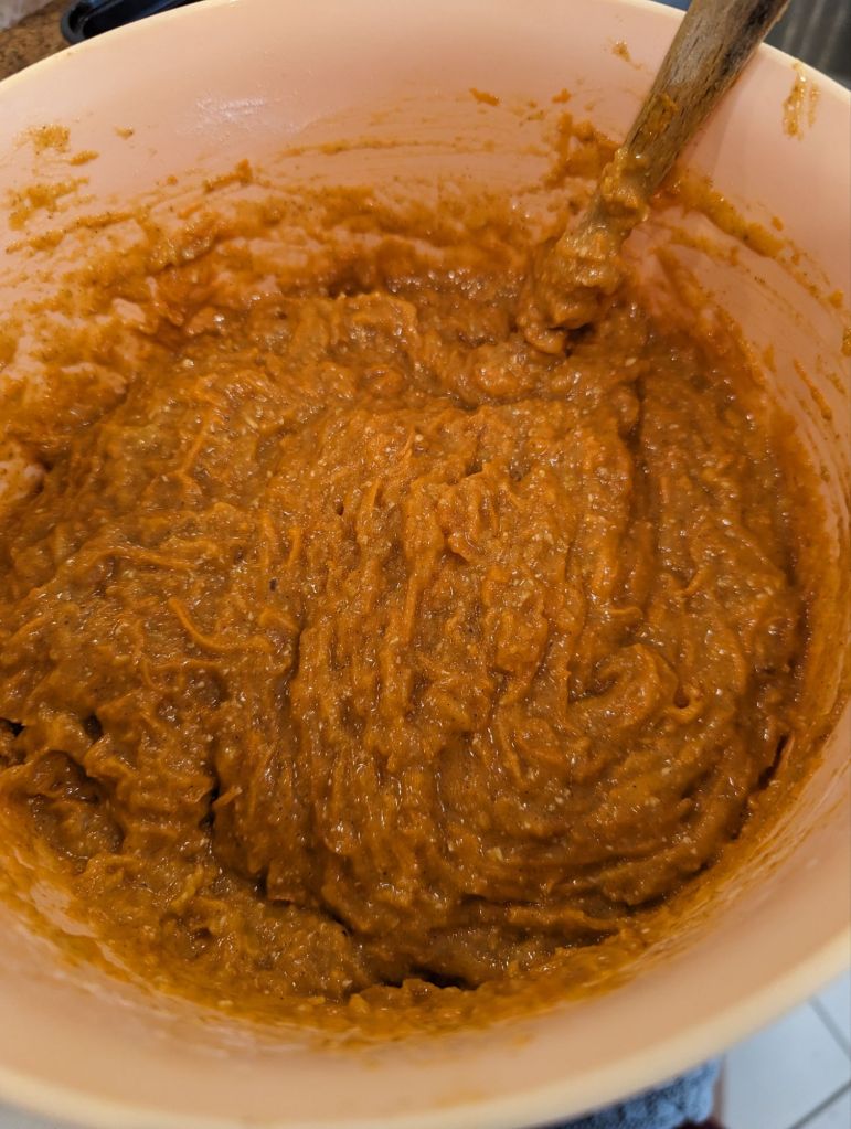 Begin by preheating the oven to 350 degrees. In a mixing bowl, mix 1 cup flour, 3/4 cups almond or oat flour, 1/4 cup flax flour, 1 1/2 cup sugar. 2 teaspoon baking powder, 1/2 teaspoon baking soda, 1/2 teaspoon salt, and 1 teaspoon cinnamon. Stir to combine.