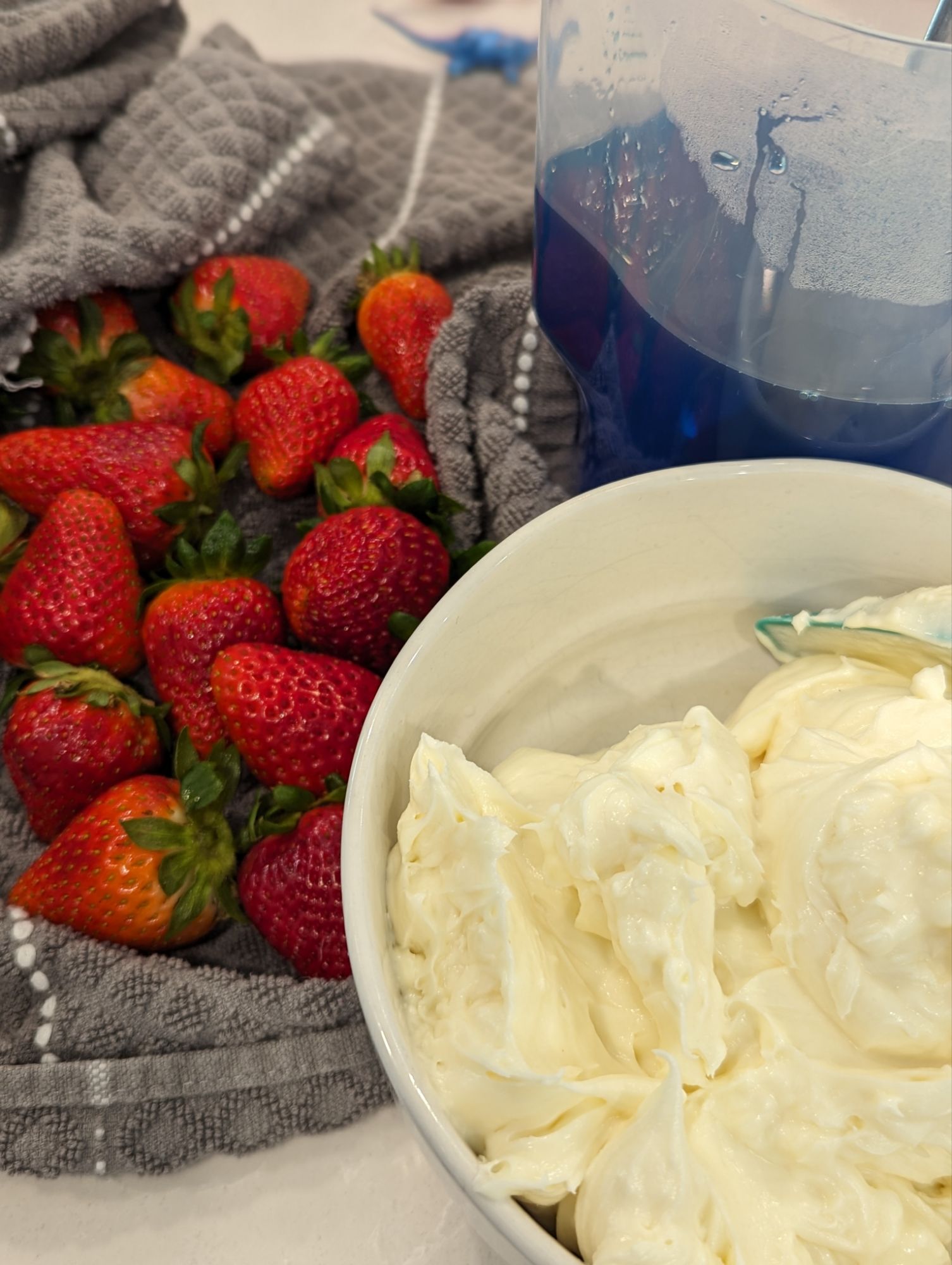 6) Prepare strawberries by washing and letting them dry. I removed the green leaves and sliced them in half.