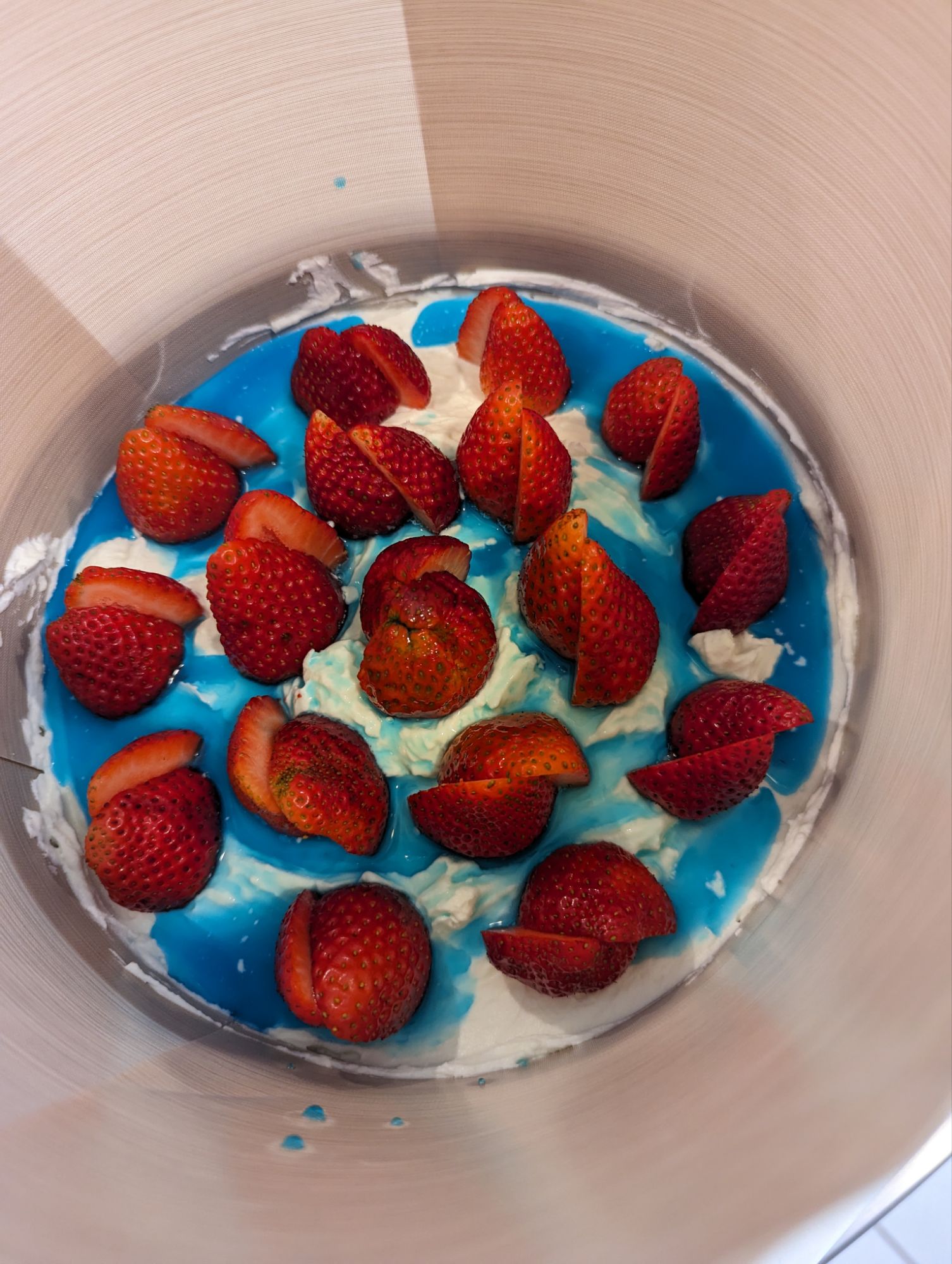 Pour cream cheese mixture into an acetate or line 9 inch springform cake pan. Place into the fridge and chill for an hour. While the cake is cooling, place the Jello into a heat safe container. For every Jello box, add 1 cup of boiling water. Let it cool to room temperature. Prepare strawberries by washing and letting them dry. I removed the green leaves and sliced them in half.