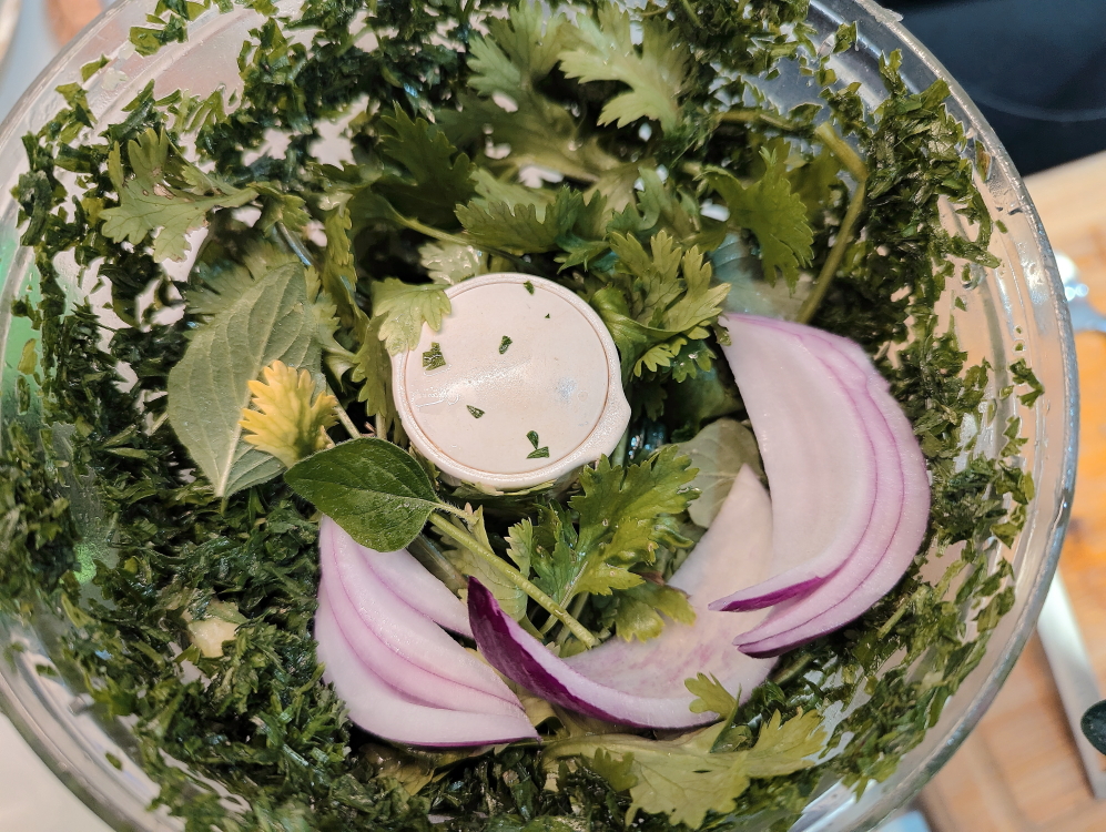 Add your carrot tops, herbs and onion to a food processor. Blend until coarsely chopped.