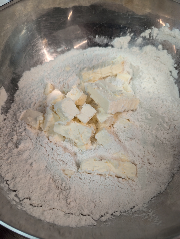 Pre-heat the oven to 425 degrees. In a bowl, add your flour salt, sugar, baking powder and baking soda. Mix well. Add your cold butter and break it up into pea sized pieces.