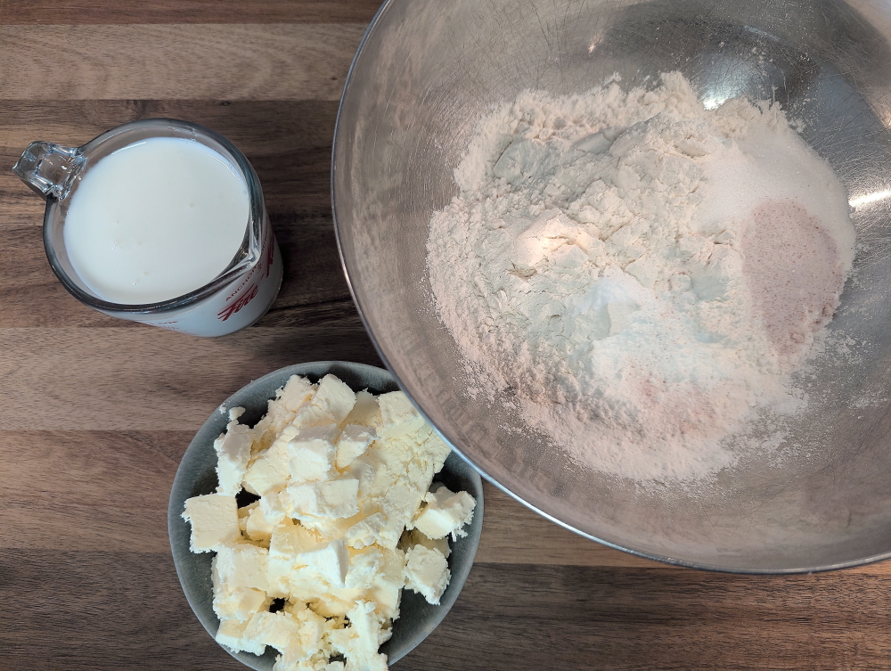 Pre-heat the oven to 425 degrees. In a bowl, add your flour salt, sugar, baking powder and baking soda. Mix well. Add your cold butter and break it up into pea sized pieces.