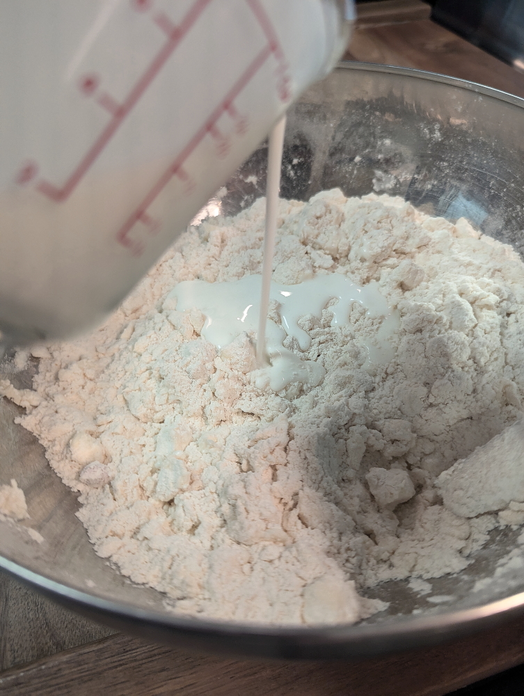 Pour in the buttermilk and mix until it becomes a shaggy dough.