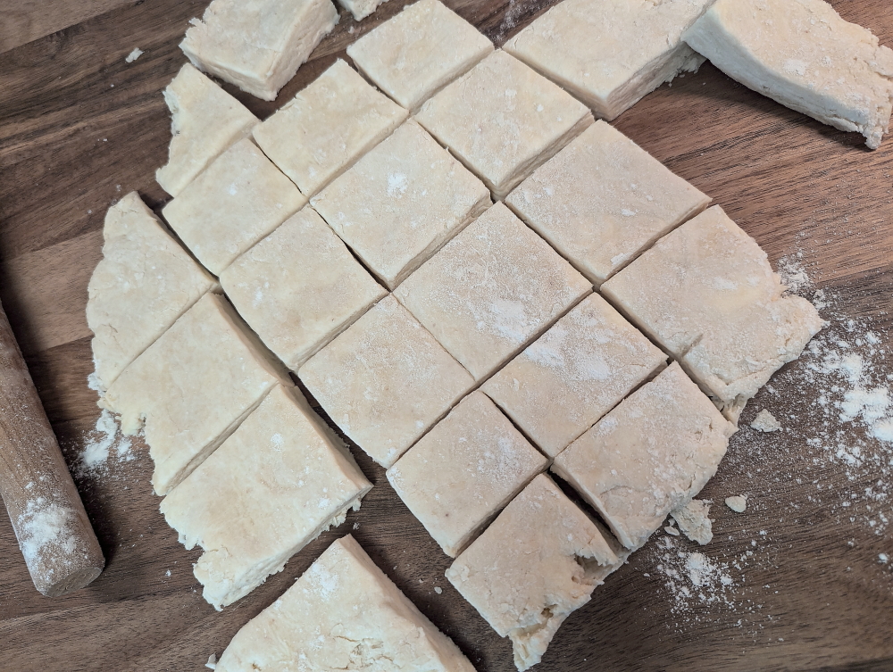 Roll out the dough until it is 1 inch thick. Cut into squares.