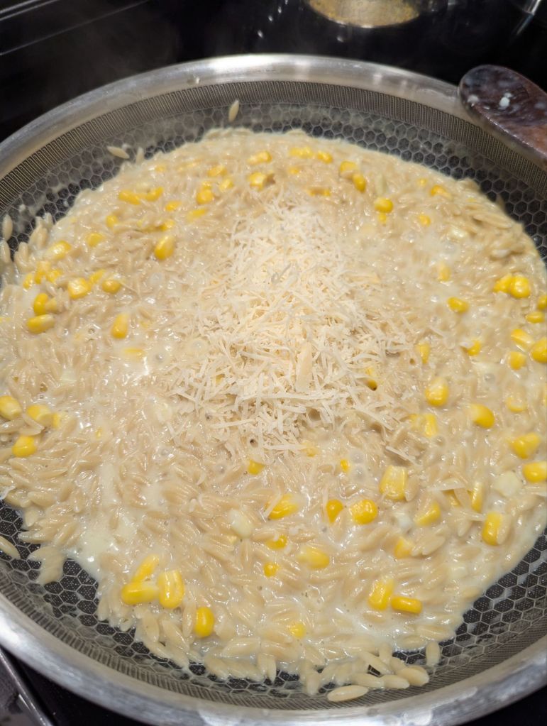 Add 2 cups Orzo, 2 1/2 cup water, 1 cube chicken boullion, 1 cup milk and 1 tbsp butter. Cook for 20 minutes on medium-low or until Orzo is soft. Add 1/2 cup Parmesan Cheese and 1/4 cup corn niblets.