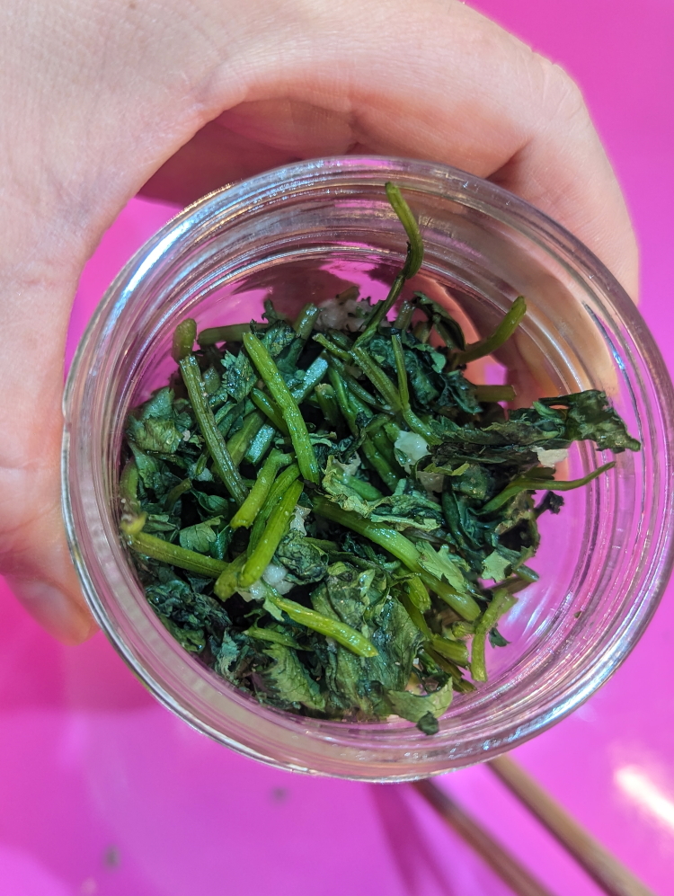 Place the cilantro into a clean jar and store in the fridge. Mandy says you can eat this right away but it tastes best after 3 weeks. This is what it looks like right after I made this recipe. It is still green but muted since it is dehydrated.