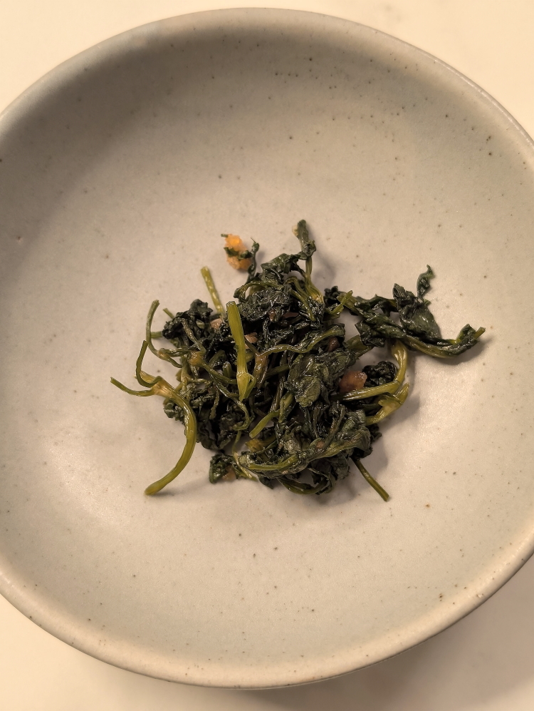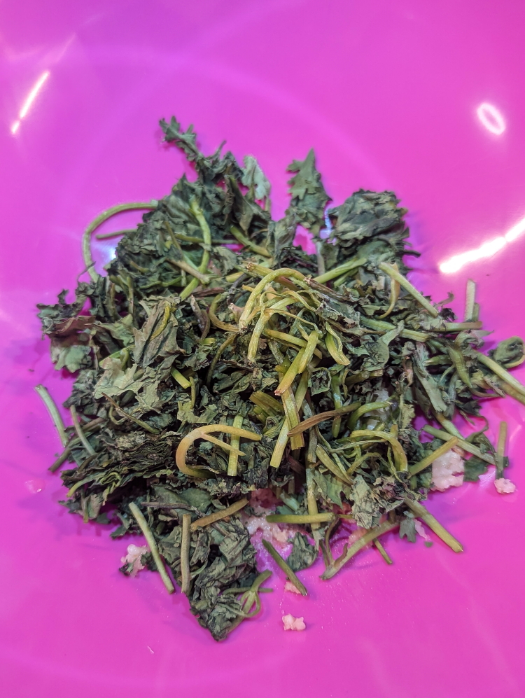The first step to this recipe is to wash and dry the cilantro. Then place it in a dehydrator on herb setting (95 degrees) for 3 hours until the cilantro is wilted.