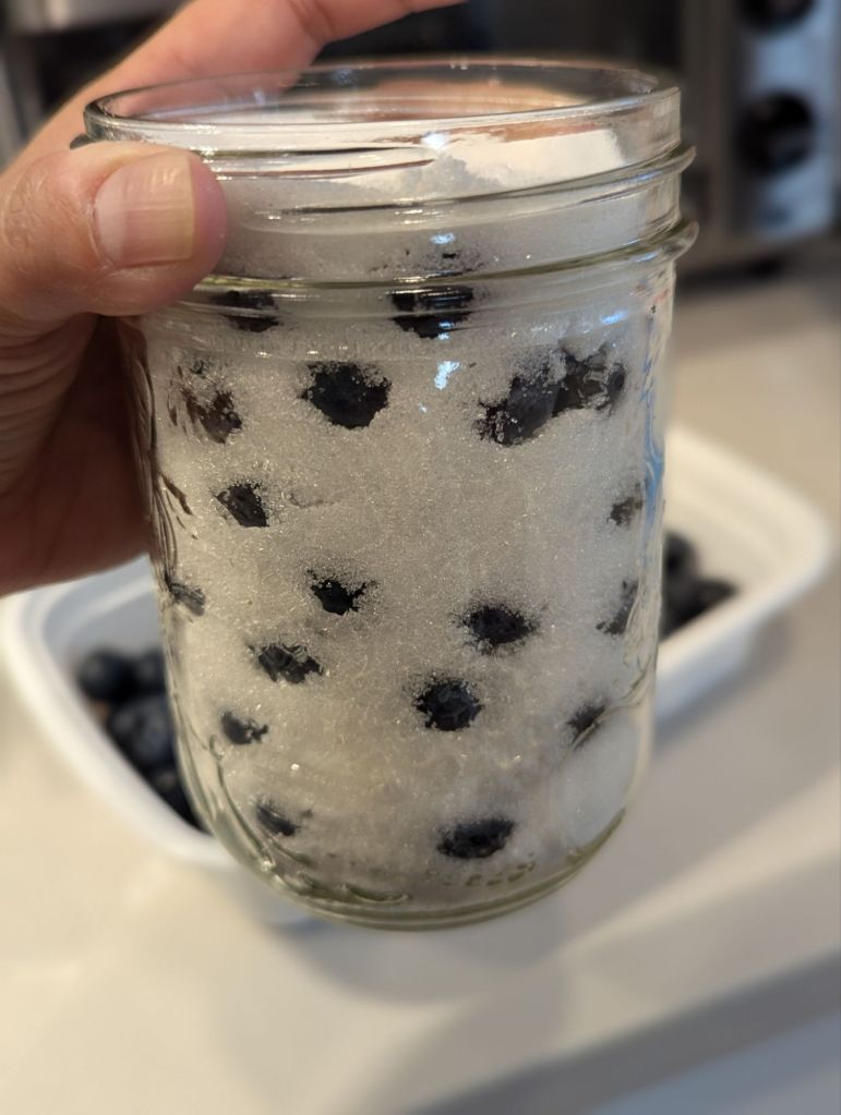 - Add more blueberries and then sugar. Continue this process until the jar is full.