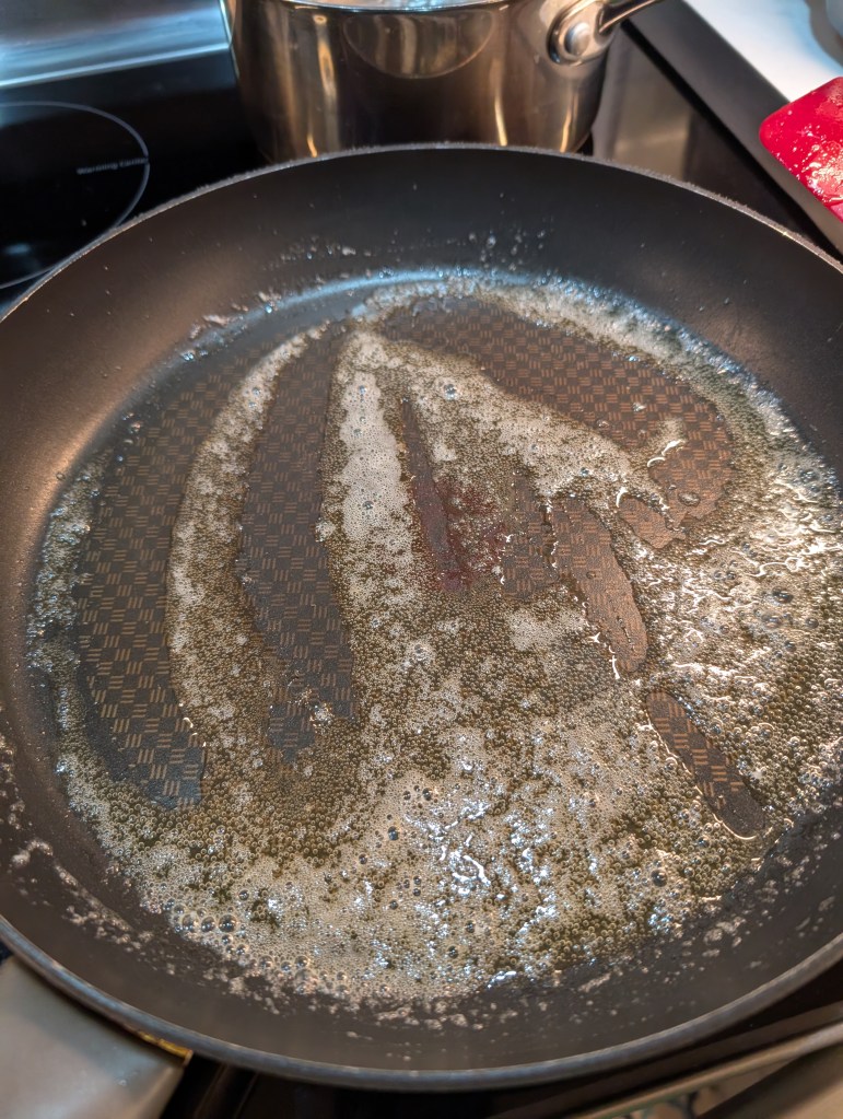 In a pan, brown some butter. You can tell when the butter is ready as it starts to bubble then the bubble subside.