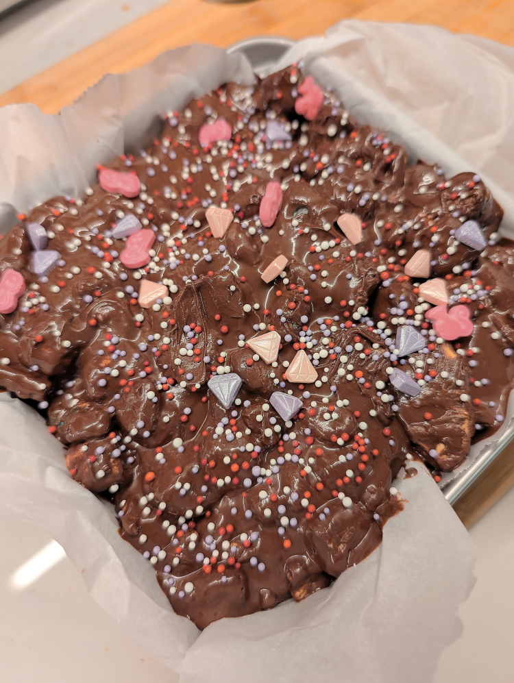Line a pan with parchment paper. Pour the chocolate mixture into the pan and bang it on the counter top a couple of times to help the mixture settle. Add sprinkles on top if you want.