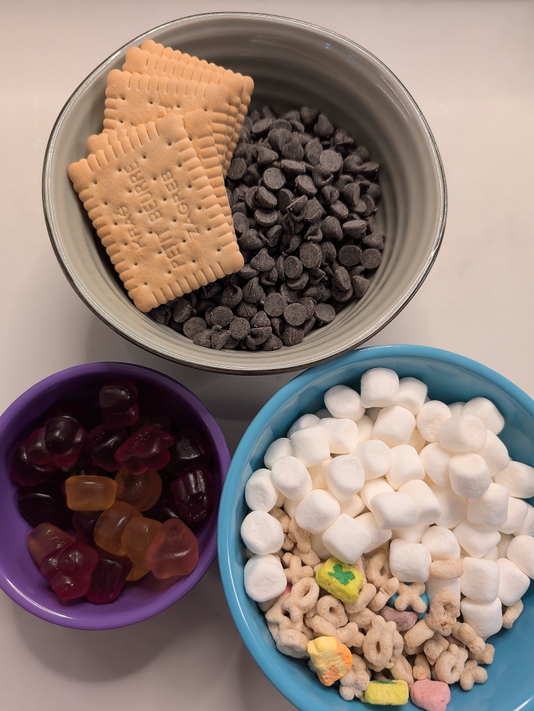 This weekend is Family Day weekend. I thought this recipe is perfect to make with your kids. The recipe is versatile and you can switch up your ingredients to things you like. For my recipe, I chose lucky charms (my son’s current favorite cereal), mini marshmallows, fruit gummies and biscuits that I had in my cupboard. Yes just find things that are in your cupboard. The main part of this Rocky Road recipe is chocolate chips and nutella. You can have your kids make these on their own using the microwave or help them make this over the stove top.