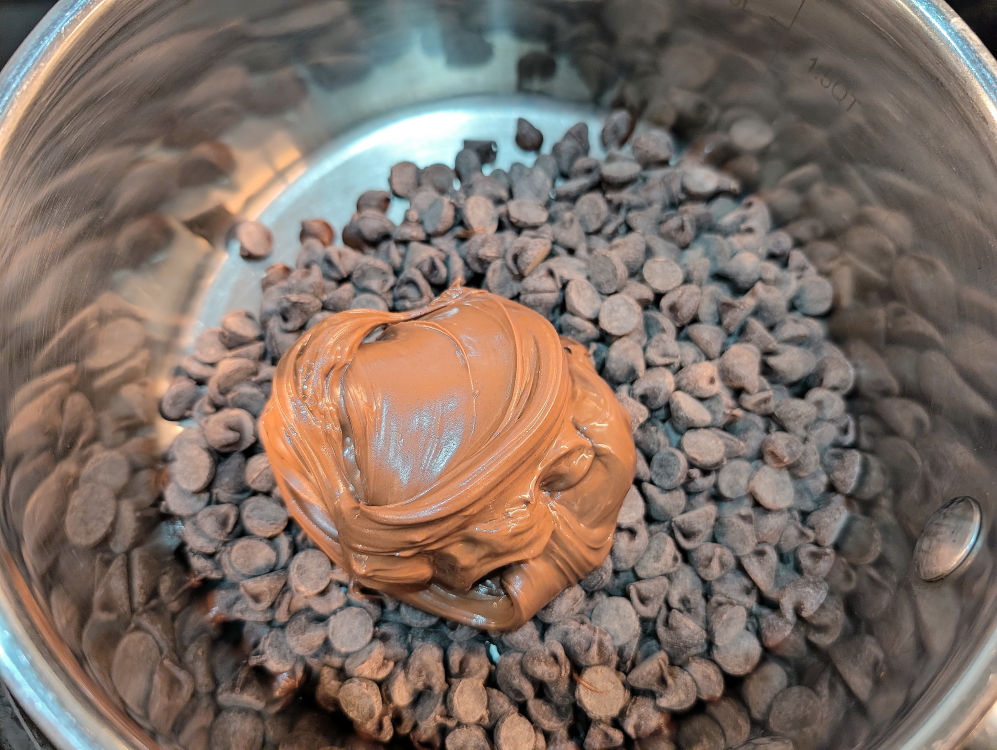 Begin by melting the chocolate chips and nutella in a sauce pan over low heat or in the microwave.