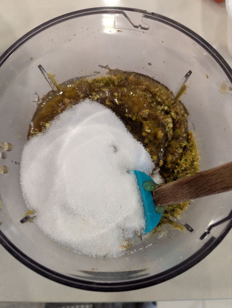 - Make the filling by processing the pistachios. Do this by using a food processor and blending the pistachios until it is a fine grain consistency.