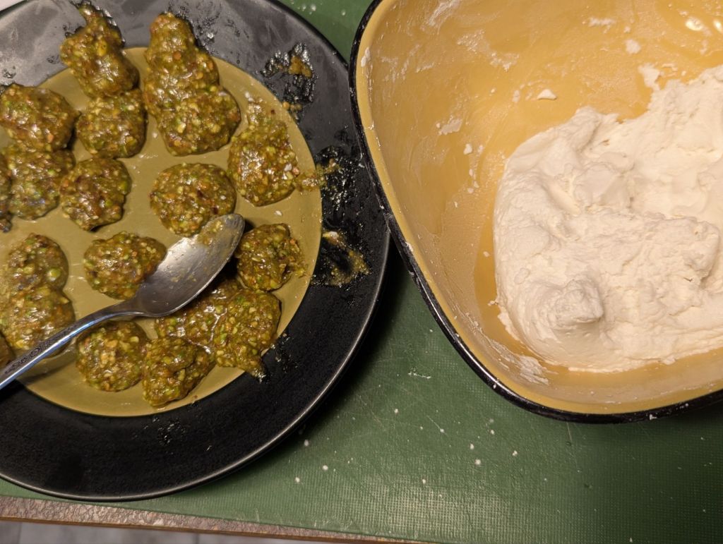 Start by making the filling by processing the pistachios. Do this by using a food processor and blending the pistachios until it is a fine grain consistency. Add the 2 tbsp liquid honey and 1 tsp sugar. Mix well. Portion out the filling into 12 balls and place in the freezer to set.