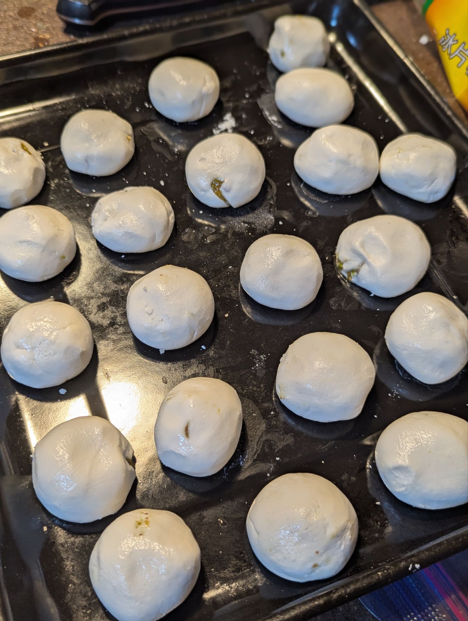 - Portion the dough into 12 balls. Flatten the balls and place a filling ball into it. Completely wrap the filling with the dough. Continue with all 12 balls.