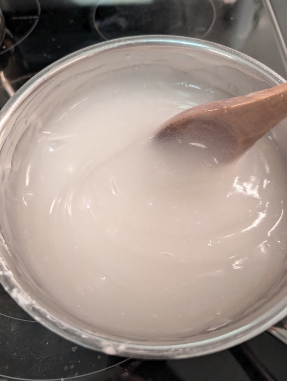 In a pot mix together water and mung bean starch. Cook on medium heat until the mixture thickens and becomes glossy and translucent. Remember to keep stirring to make sure it does burn or stick to the bottom.