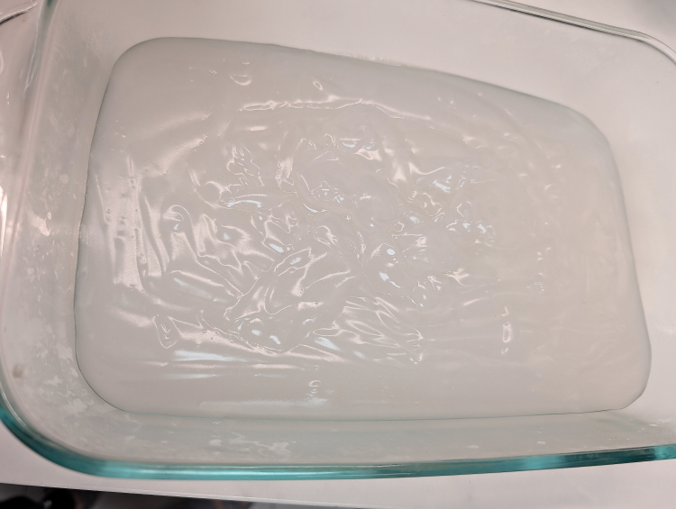 In a saucepan, mix together the mung bean starch and water. Heat on medium heat and continuously stir until the mixture thickens and gets glossy and translucent. Pour thickened mixture into a rectangular dish and allow to cool. I put mine in the fridge after cooling for a bit.