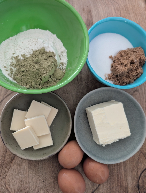 This is a simple yet delicious recipe. You will need white chocolate, butter, eggs, vanilla, sugar, brown sugar, flour and matcha.