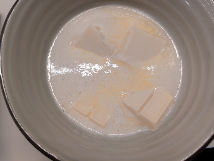 In a microwave safe bowl, melt the butter. When hot, break up the white chocolate in chunks and add to the butter. Allow the chocolate to melt. Stir together and allow to cool.