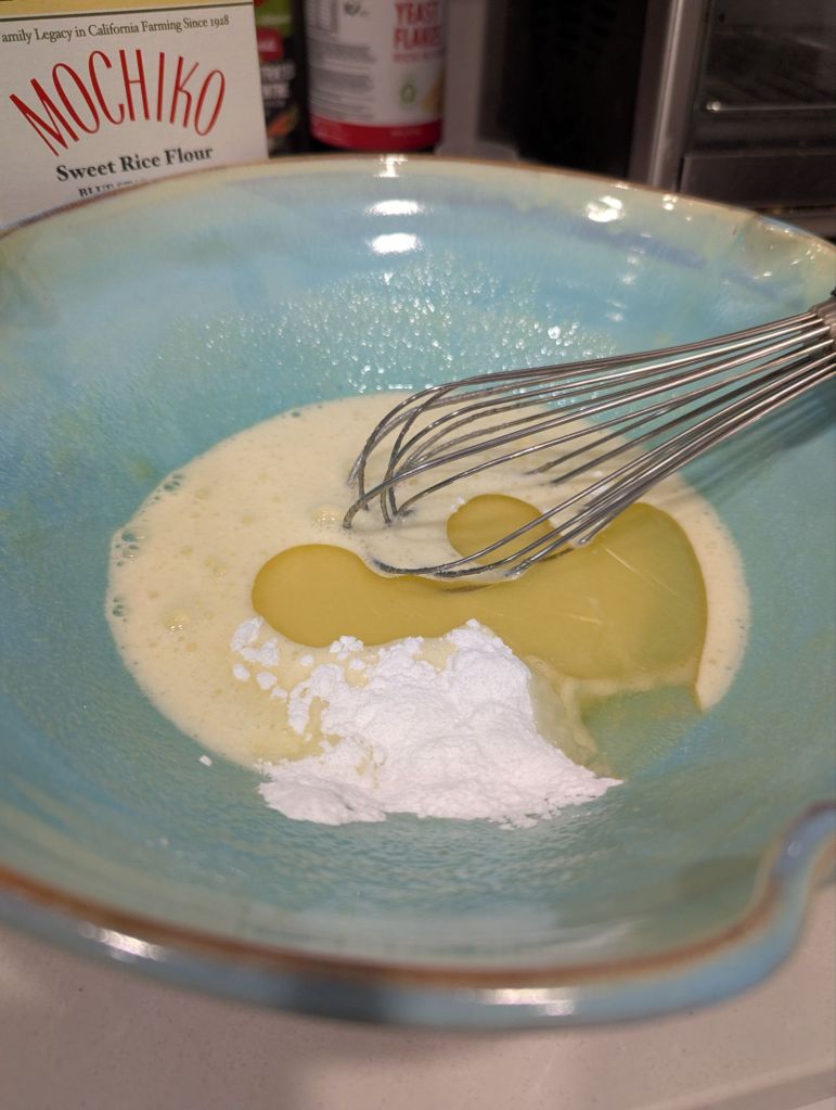 Slowly add a bit of milk and stir the ingredients. Add some mochiko flour and stir in. Alternate between milk and flour until both are done. Mix the batter and let it sit for 15 minutes.