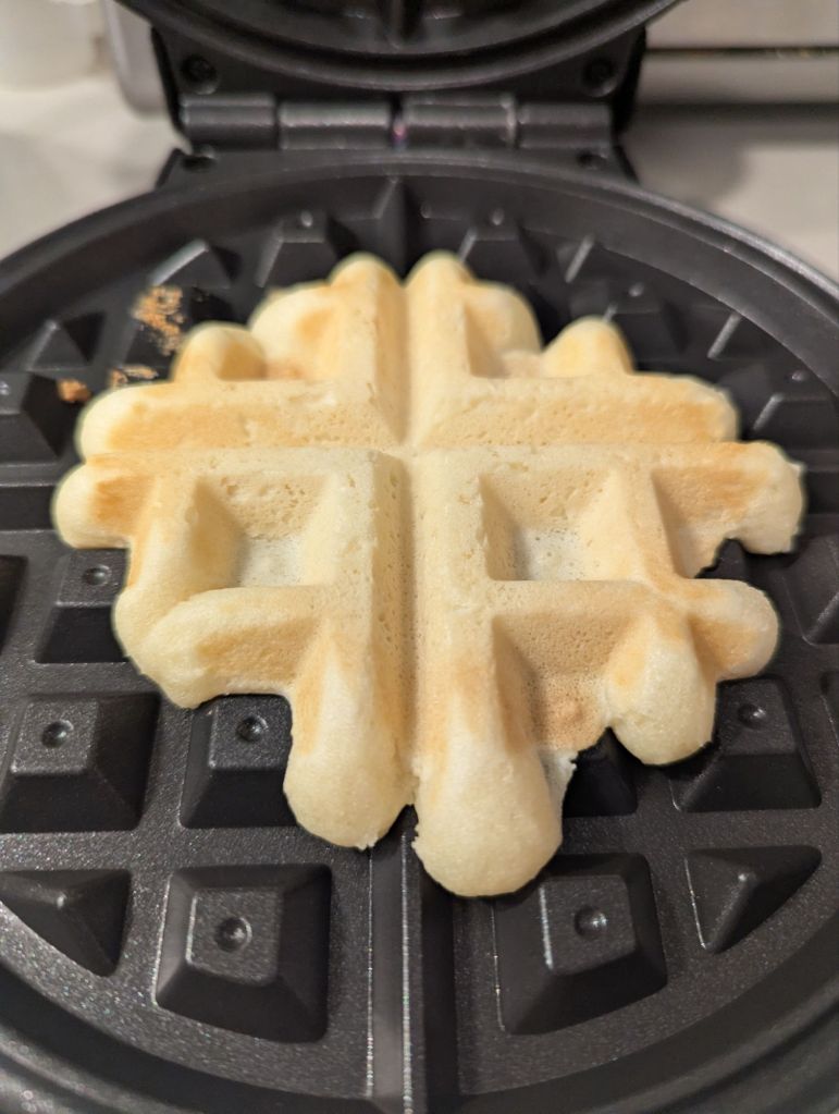 - Heat up a waffle iron. When ready, add a scoop of batter to the waffle iron and let it cook. If you like it crispier, leave the waffle longer. After 3-4 minutes check the waffle and remove if golden brown.