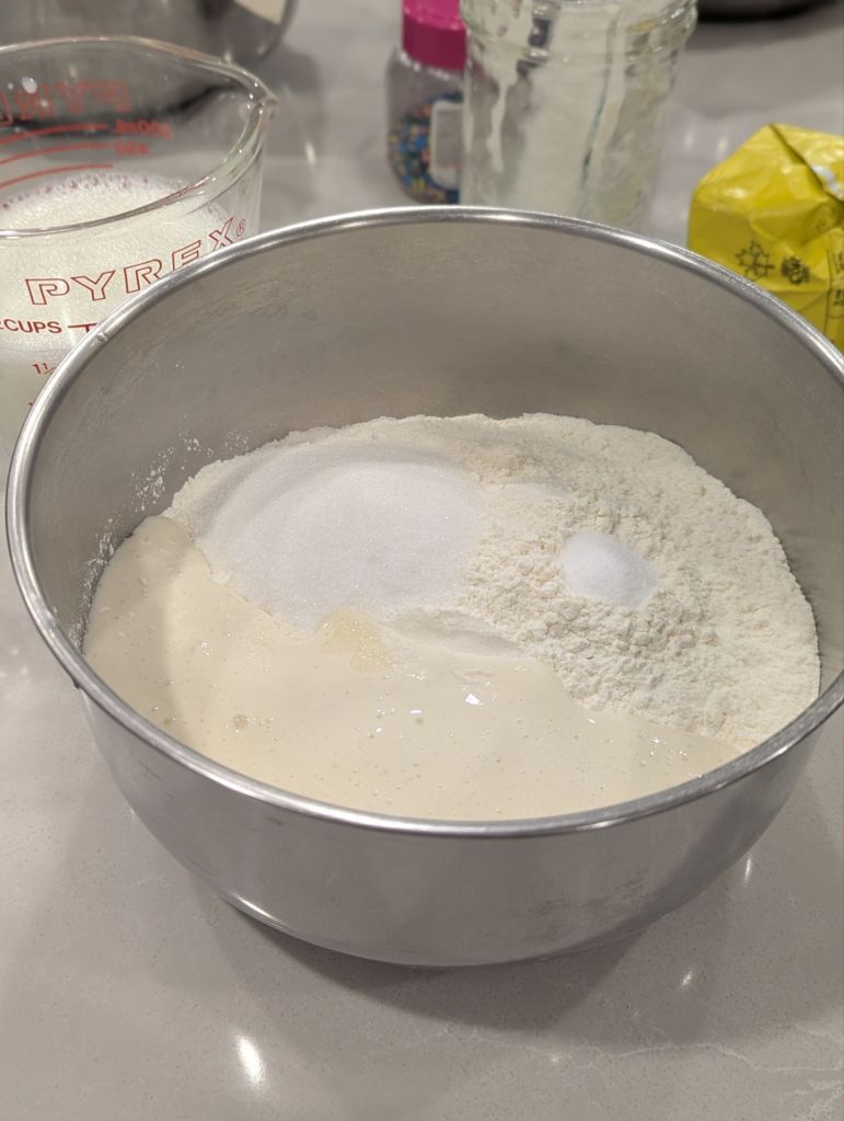 - Mix 2 cups flour, 1 1/3 teaspoon sugar, 1 tsp salt, 1/2 cup sourdough starter, 1/2 cup milk, and 1/4 cup water until you get a rough dough ball.