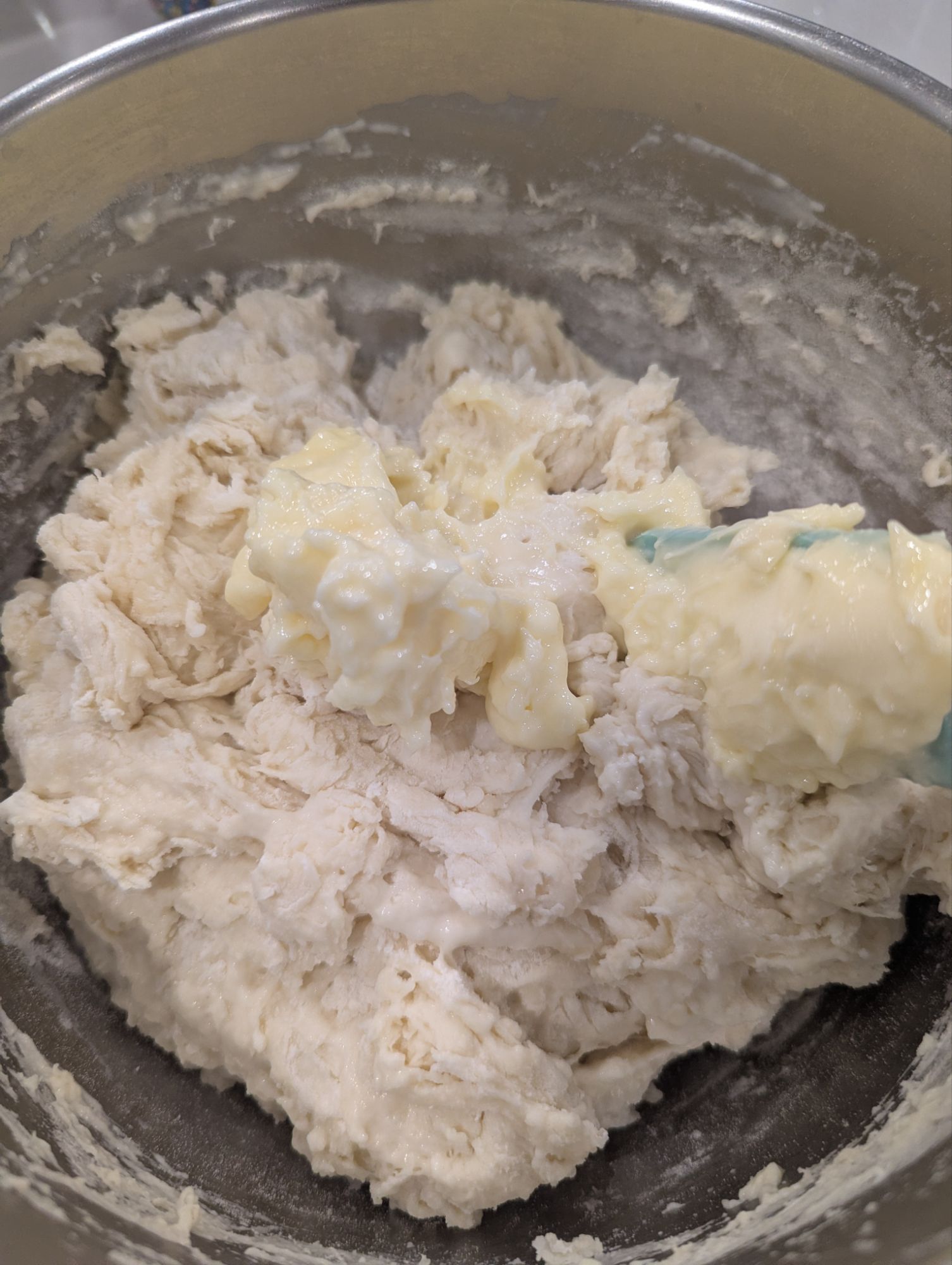 - Mix in the semi-melted butter (2 1/2 tsp) into the dough. Use a spatula to prevent a sticky dough mess.