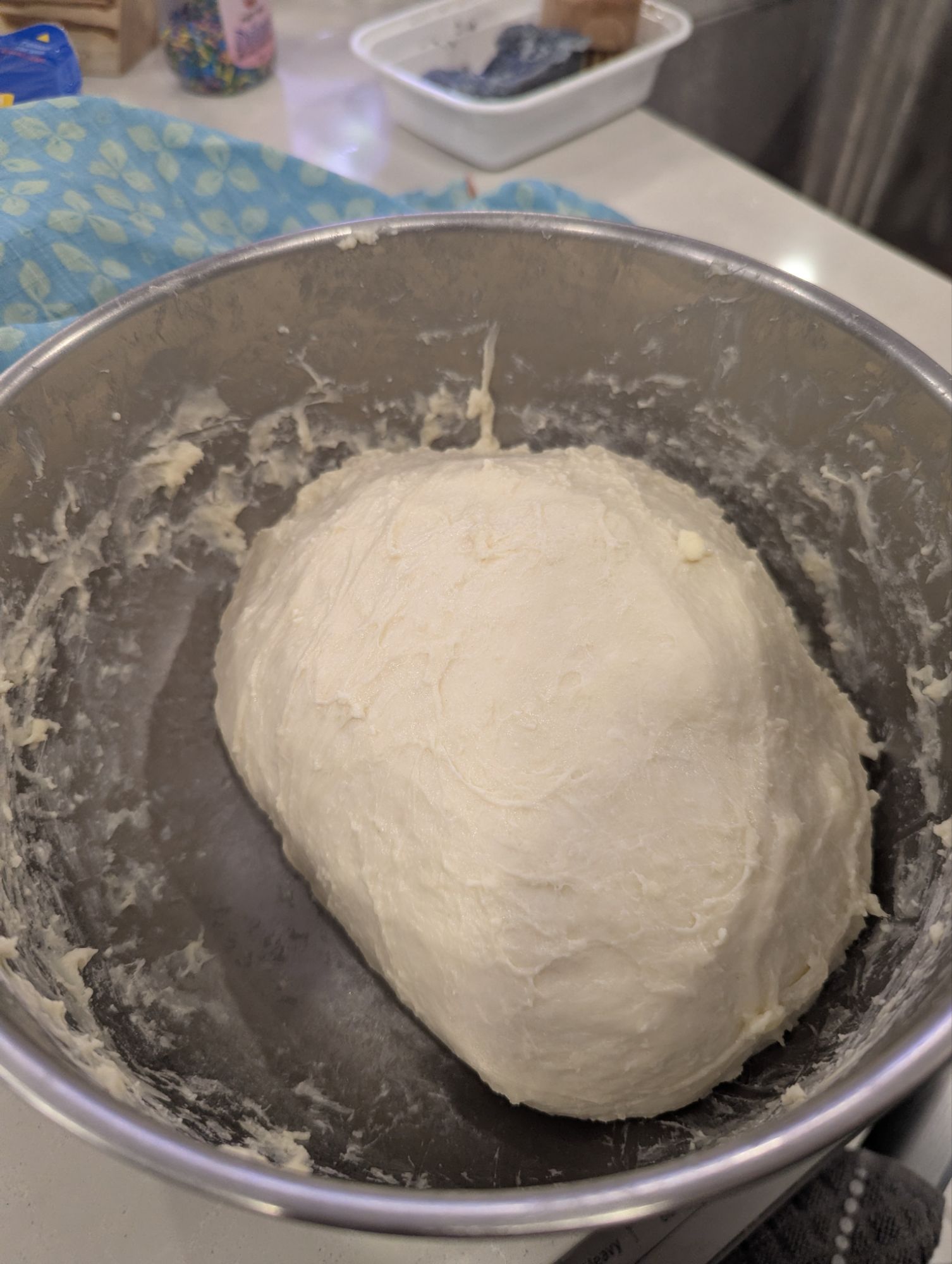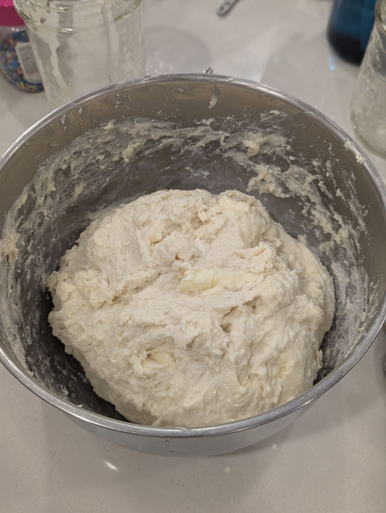 Start by mixing 2 cups flour, 1 1/3 teaspoon sugar, 1 tsp salt, 1/2 cup sourdough starter, 1/2 cup milk, and 1/4 cup water until you get a rough dough ball. Mix in the semi-melted butter (2 1/2 tsp) into the dough. Use a spatula to prevent a sticky dough mess.