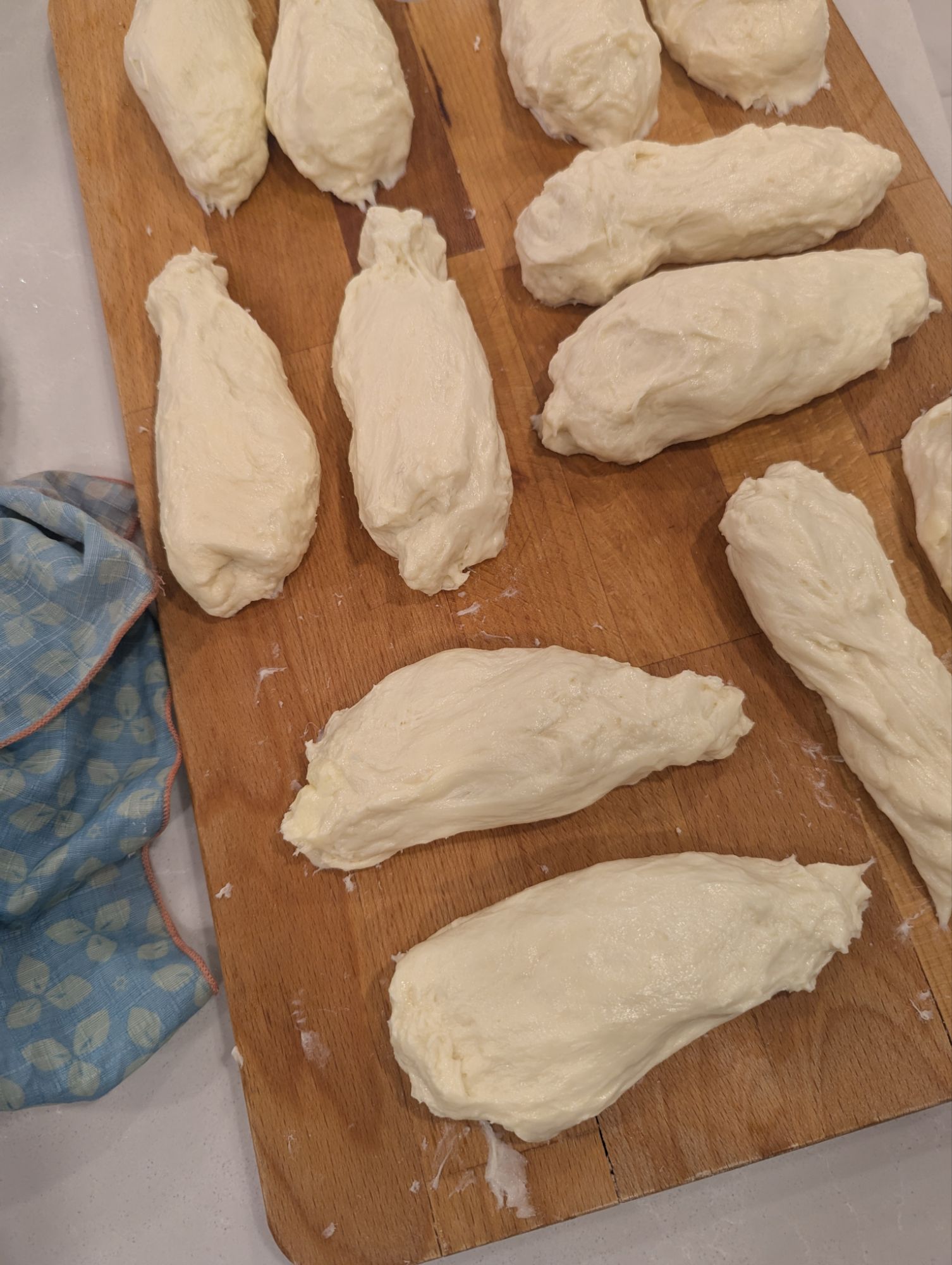 - After the dough has rested, place the dough on a cutting board and cut into 6 pieces. The easiest way is to cut it like a pizza. Roll into icicles and let the dough rest for 15 minutes.
