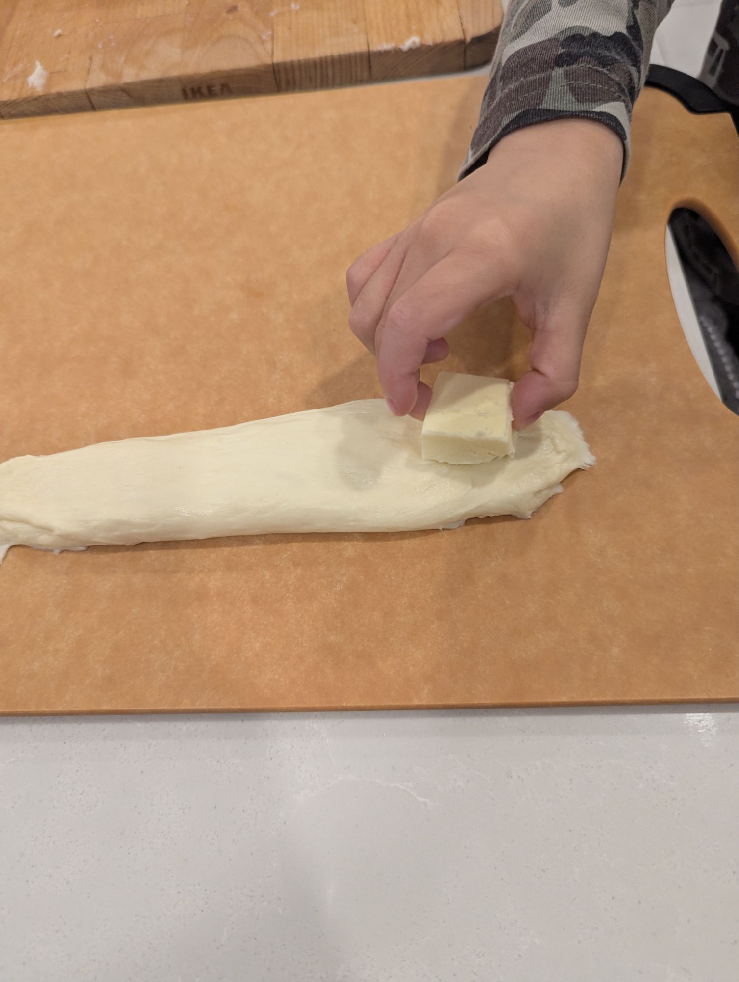 - Once rested, roll the dough out and place a chunk of butter onto the dough. Roll the butter and dough. Make sure there are not openings on the side or the butter will seep out when baking. Continue with the remaining dough balls.
