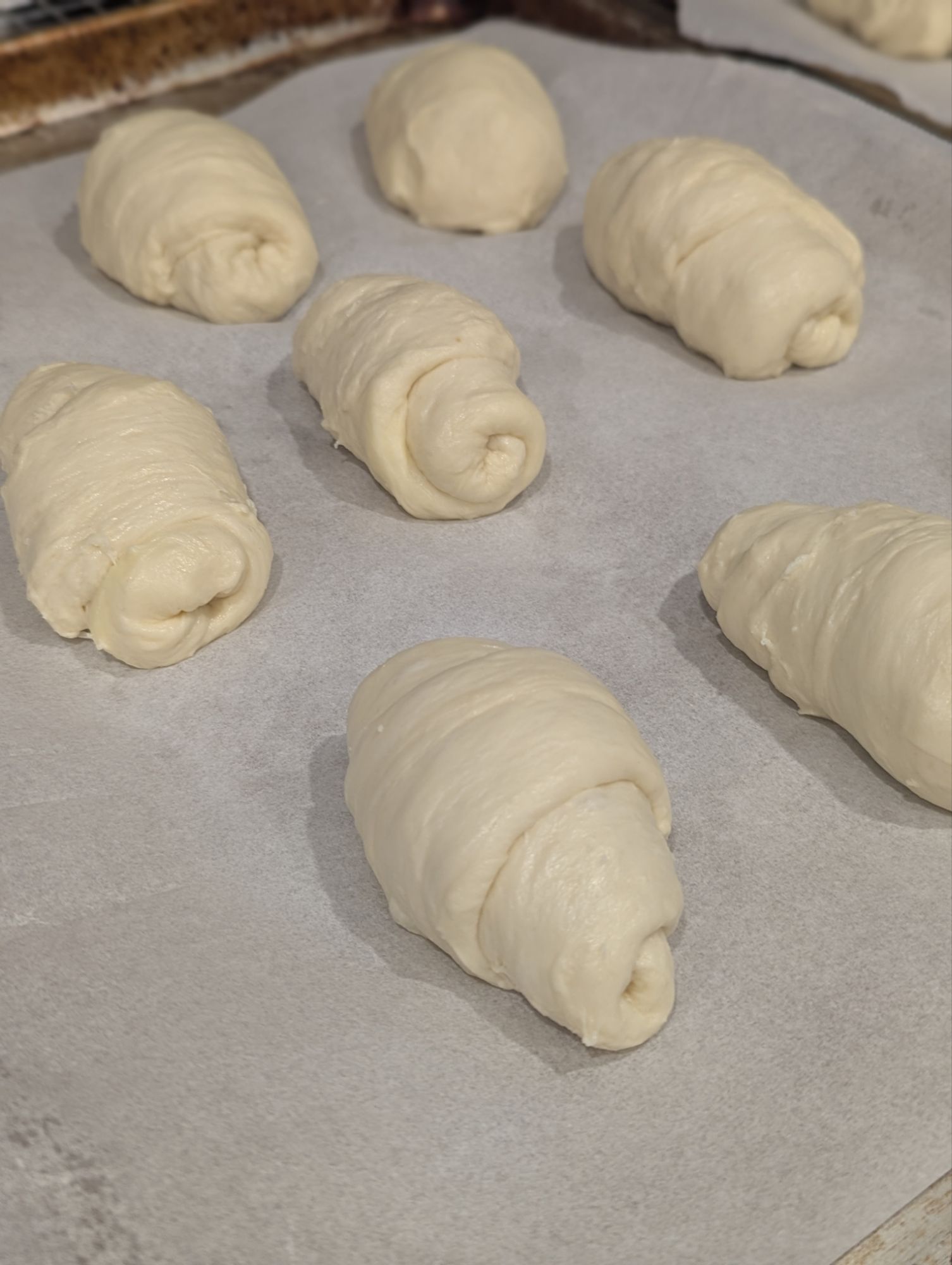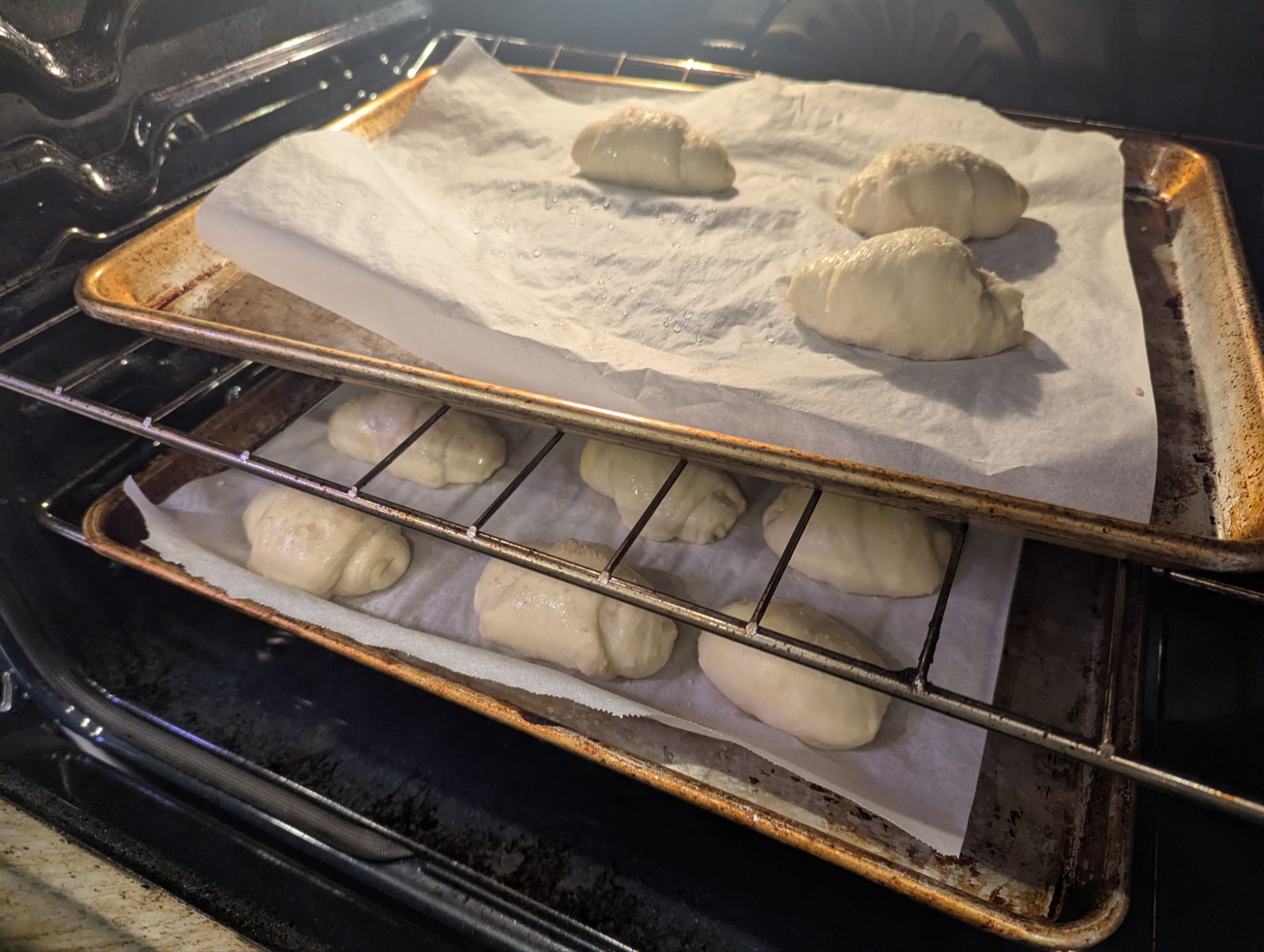 Preheat the oven to 400 degrees C. Spray dough 10 times. Quickly open oven and spray 10-15 times and then place pan in. Let the buns bake for 14-16 minutes until golden brown.