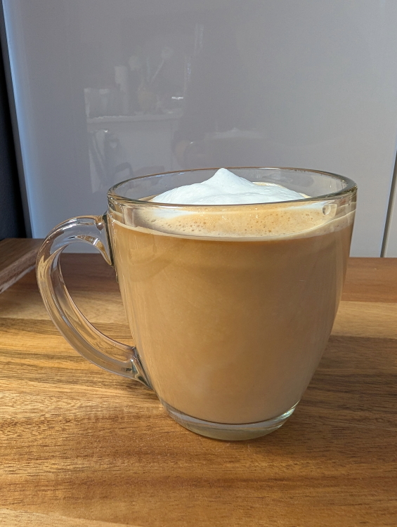 Prepare your double shot of espresso. Add about 2/3 cup of milk. Top with milk foam.