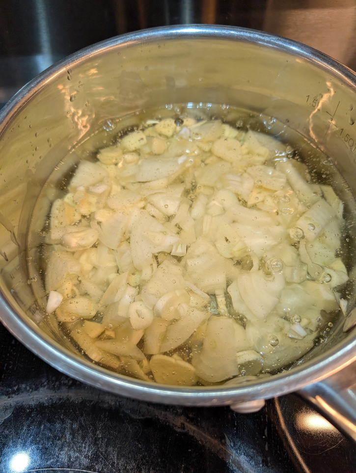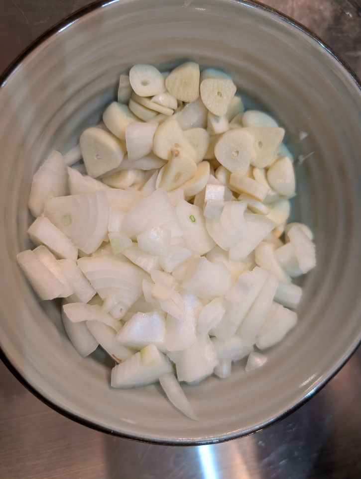 Prepare the ingredients. Chop the onion and slice the garlic. Set aside.