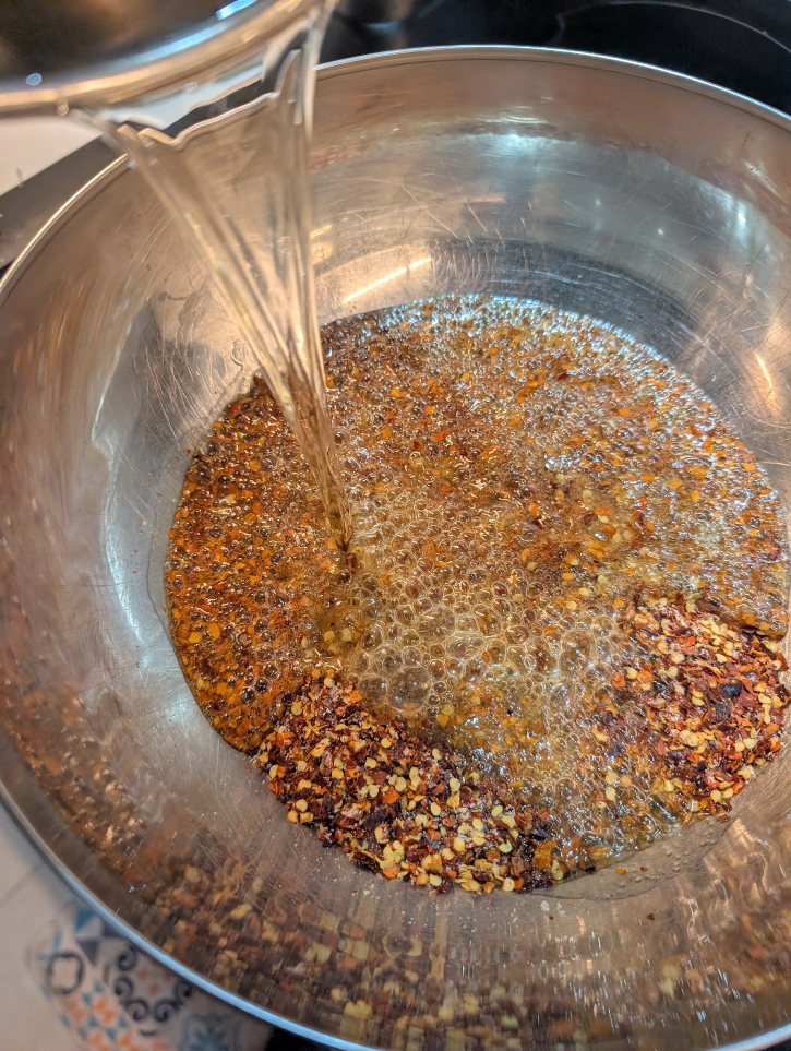 Pour the hot oil onto the chili mixture. Mix and allow the chilis to simmer.