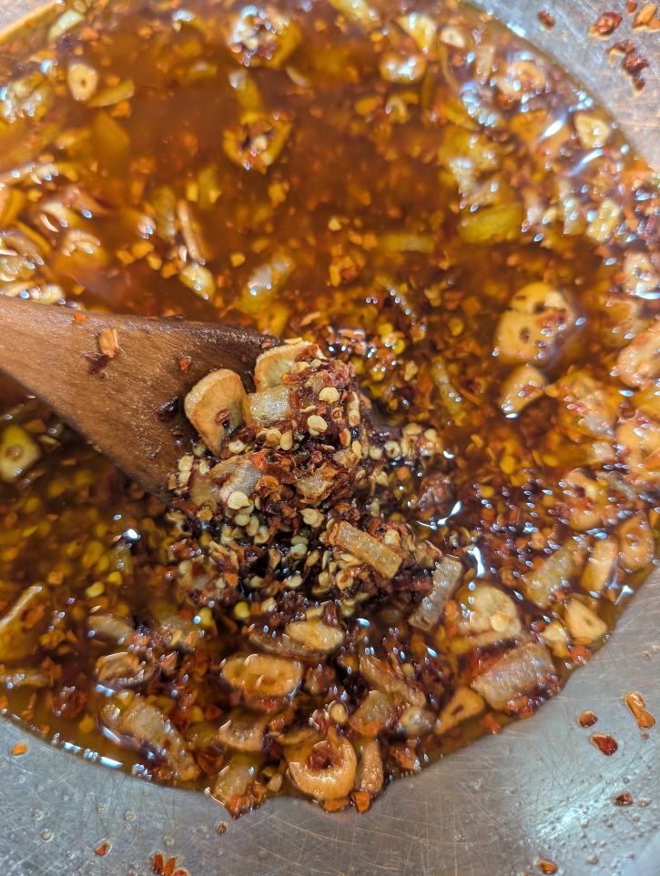 Pour the hot oil into the bowl with the chili mixture. Mix well and allow to simmer. Add the garlic and onion to the mixture.
