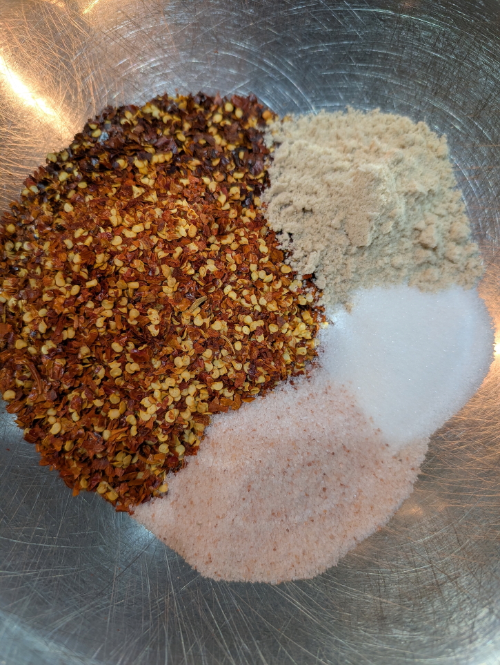In a heat safe bowl, add the crushed chili, chicken bouillon and salt. Mix the ingredients together.