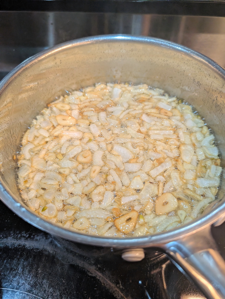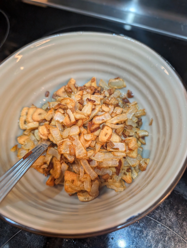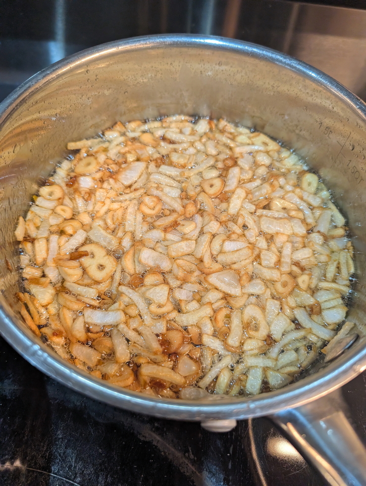 In a sauce pan add your oil, garlic and onion. Heat up the oil and allow the ingredients to simmer until the garlic is golden brown. Strain out the garlic and onion with a metal strainer. Save the hot oil.