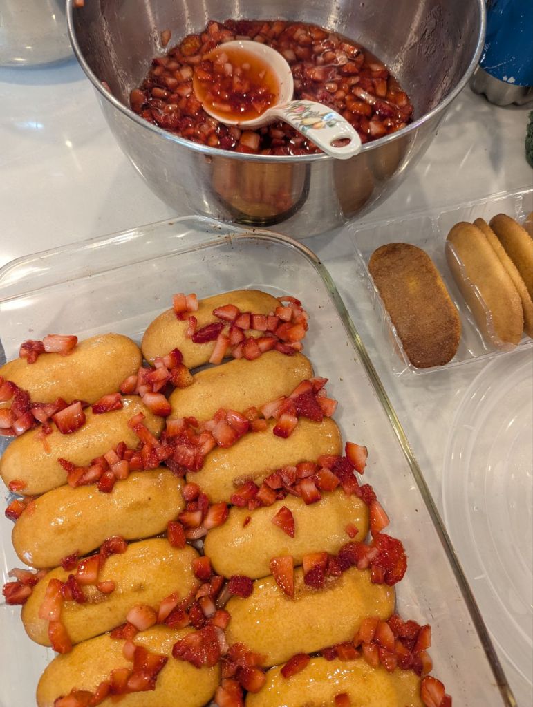 - Assembling the tiramisu. After an hour, you may see that the strawberry compote has created a bunch of liquid. This will be used as the syrup for your lady fingers. Start by dipping the lady fingers into the strawberry syrup. Don’t leave them too long in the syrup as they will break down too quickly. You want a quick dip. Layer the dipped lady fingers on the bottom of a glass baking dish. The one I used is roughly 9 inches by 14 inches. Once you get a layer on the bottom, add some cut strawberries from the compote. Add a layer of the marscapone on top. Continue layering until the tray is full. The top layer will be marscapone. Place the tray in the fridge overnight to set.