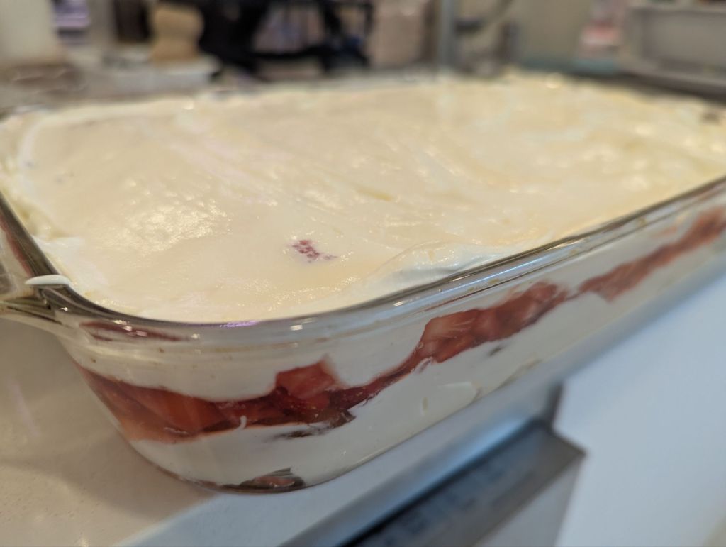 Assembling the tiramisu. After an hour, you may see that the strawberry compote has created a bunch of liquid. This will be used as the syrup for your lady fingers. Start by dipping the lady fingers into the strawberry syrup. Don’t leave them too long in the syrup as they will break down too quickly. You want a quick dip. Layer the dipped lady fingers on the bottom of a glass baking dish. The one I used is roughly 9 inches by 14 inches. Once you get a layer on the bottom, add some cut strawberries from the compote. Add a layer of the marscapone on top. Continue layering until the tray is full. The top layer will be marscapone. Place the tray in the fridge overnight to set.