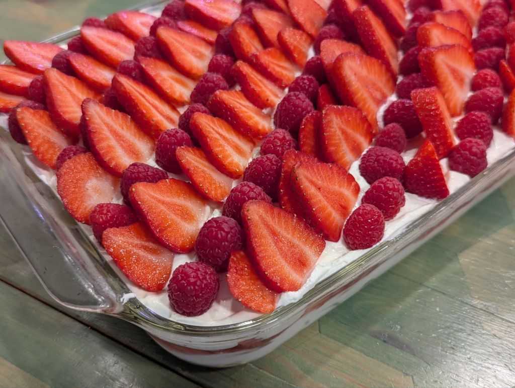 - Decorating. This step should be done the following day and before serving. Using fresh strawberry slices, start layering the strawberries in rows. Alternate the strawberries with a row of raspberries. Continue until the entire surface is covered.